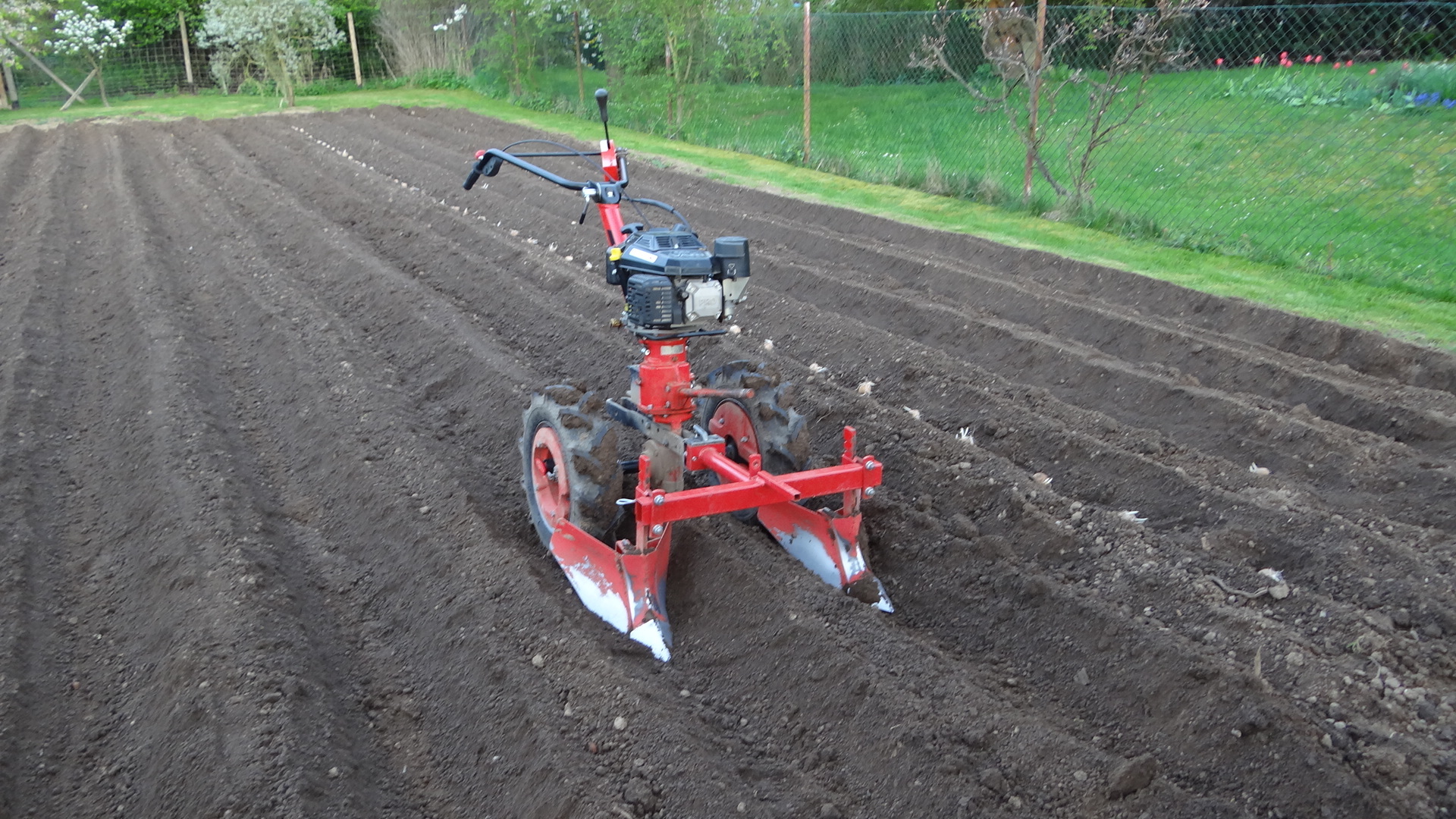 Nakypřeno máme, nohy se propadají jak do peřiny, tak jdou na řadu radličky na vytvoření řádků. Dávám je na nosič radliček dopředu před kola na vzdálenost od sebe 610 mm tak, aby kola malotraktoru jela v zákrytu. Já pro další odměření vzdálenosti vedlejších řádků používám, jak často slýchám „tu divnou tyč s řetízkem, co to je?“. Tak to je, prosím, pomocný ukazovák, který lze přehodit na nosiči radliček na obě strany a ten řetízek spuštěný k zemi kopíruje řádek již vytvořený, tedy tím nás navádí na správnou vzdálenost, ve které máme jet a tvořit řádky nové. Lze také požívat systém podle pana Šimáka, který doporučuje jet jednou radličkou v řádku již vytvořeném a druhou dělat řádek nový. Je to asi přesnější, ale zase pomalejší.