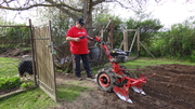 Nastává rotavátorování. Já jezdím tak, aby nože rotavátoru byly zcela potopeny v zemi. Používám na Globálu rychlostní stupeň 2 nebo 3, neboli P. Účelem je dostatečně nakypřit hlínu bez hrud, aby se pak dobře dělaly řádky s radličkami.